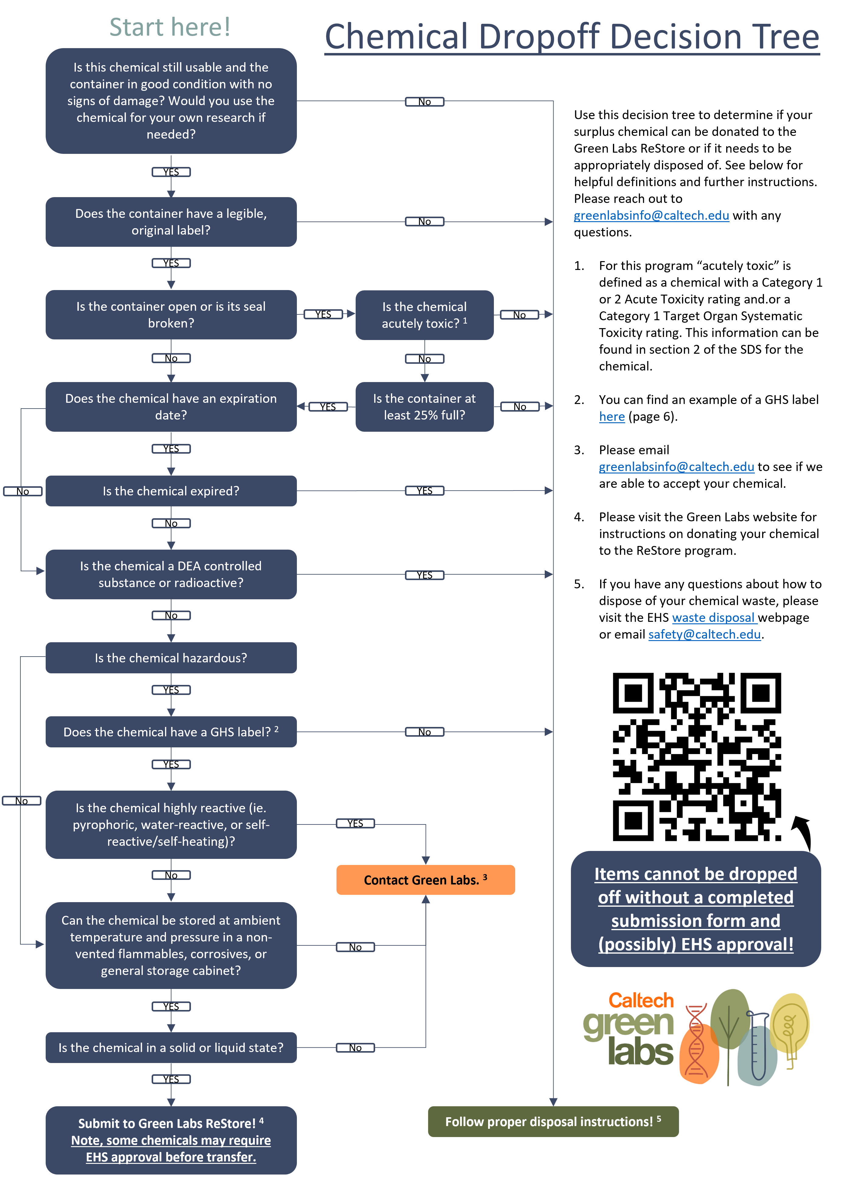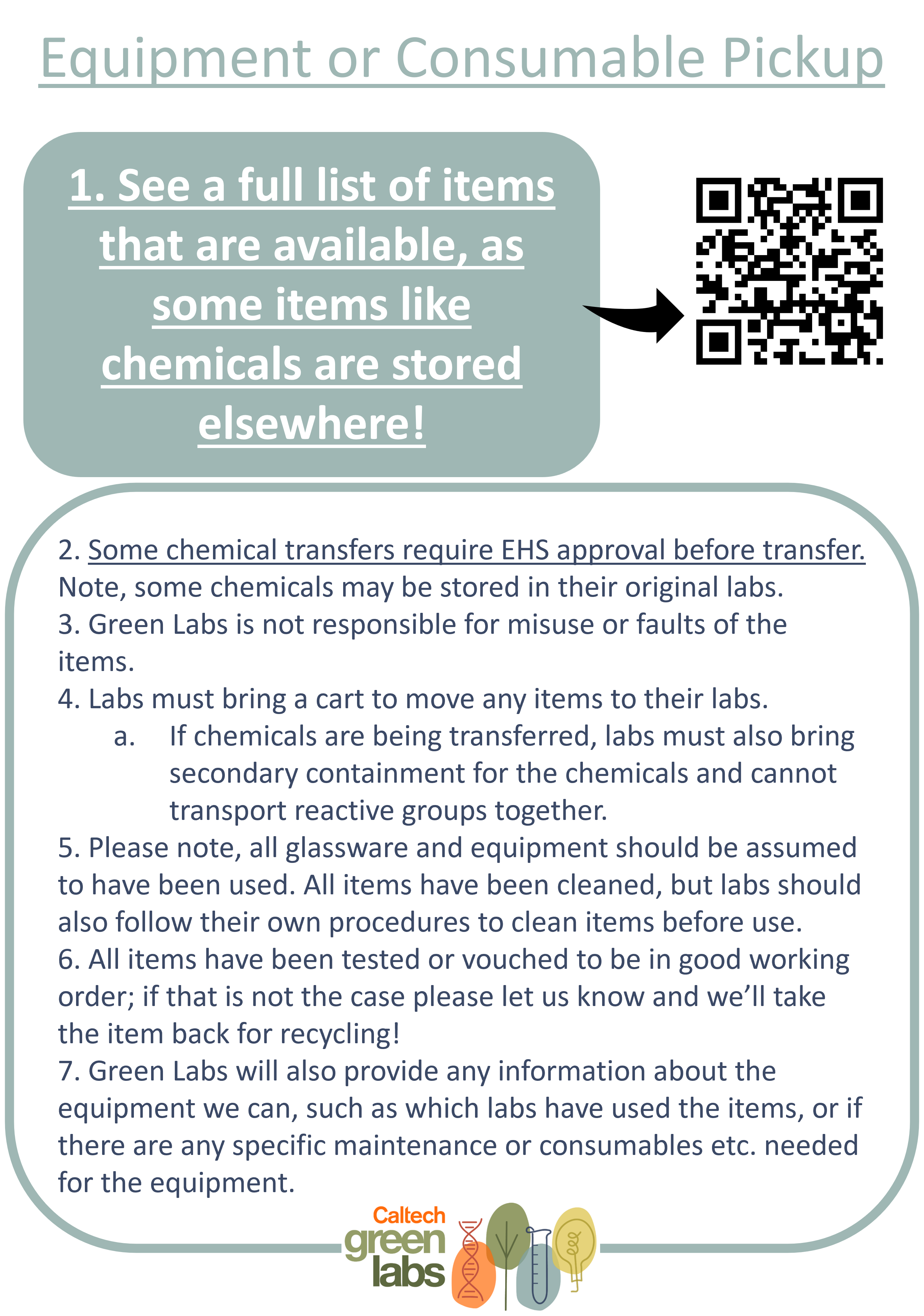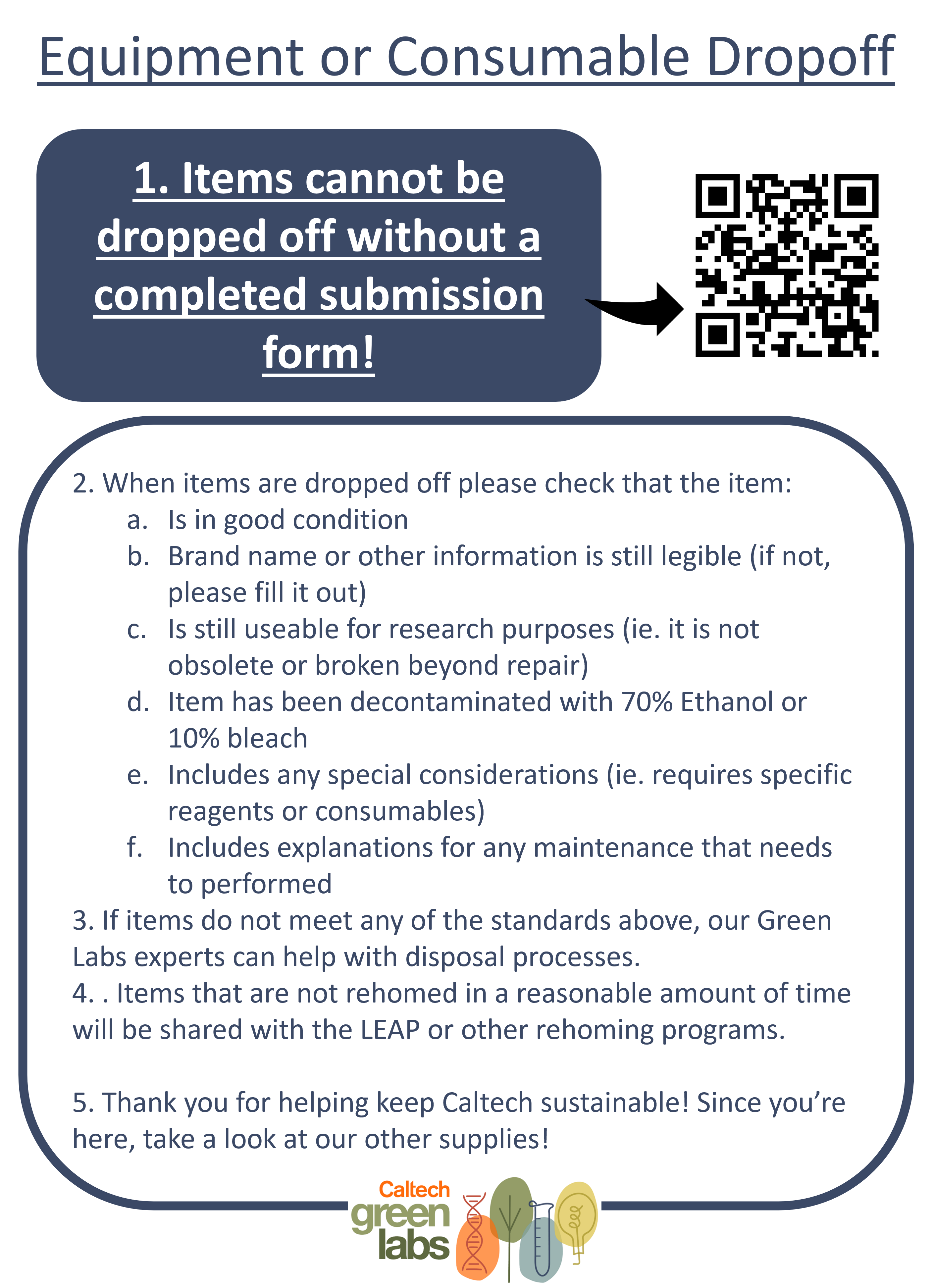 Want to see if your items can be donated? Check out our checklists above for equipment or consumable dropoffs or pickups, and our chemical dropoff decision tree!