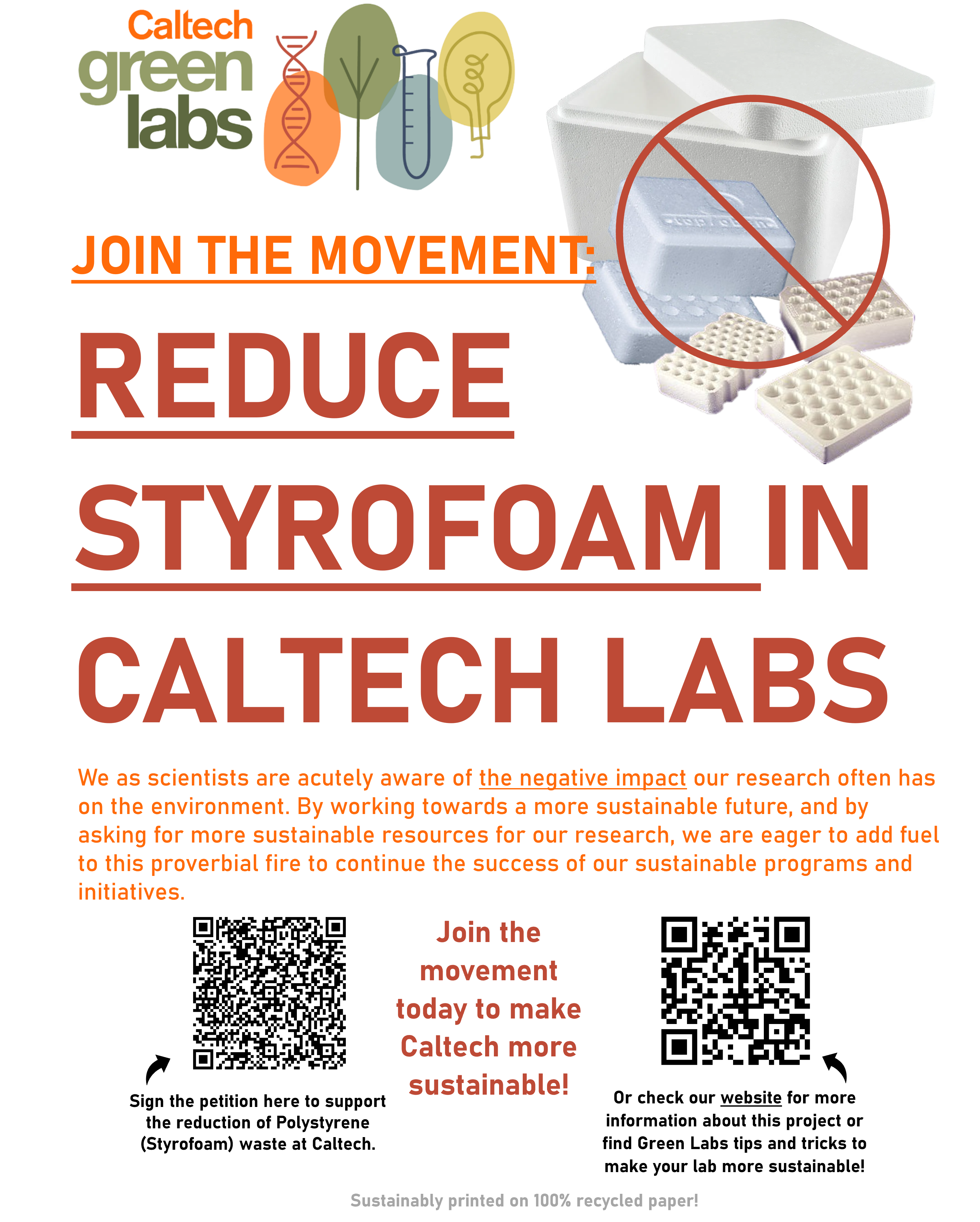 We, the staff, students, and faculty at Caltech, sign below to support the reduction of Polystyrene (Styrofoam) waste at Caltech.